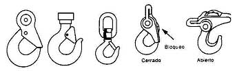 Figura 11 distintos tipo de seguros El mencionado accesorio de seguridad por lo general es una lengüeta que impide la salida involuntaria de la eslinga, cable o cadena, en la figura 11 se representa alternativas de los mecanismos de bloqueo (lengüetas), antiguamente los ganchos no disponían de este seguro, de existir alguno de ellos en uso se debe efectuar un seguro como se indica en la figura 12.