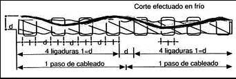 Antes de realizar el corte de un cable, es necesario asegurar todos los cordones para evitar el deshilachado de estos y/o el descableado general. A cada lado del lugar donde se ha de realizar el corte, se deben efectuar cuatro ligaduras repartidas en un paso de cableado, como se observa en la figura 12.