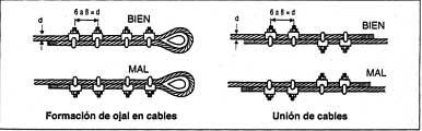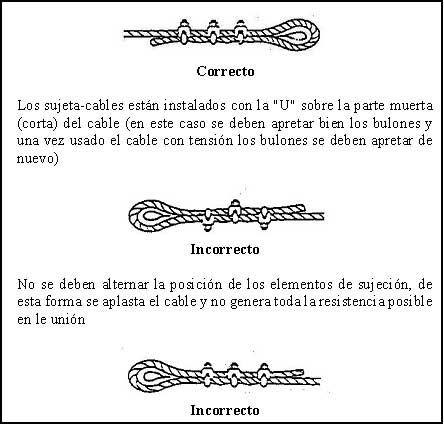La unión de dos cables no debe efectuarse mediante nudos o soldaduras, pués tanto una como otra deterioran los cables. Las uniones de dos cables se deben efectuar utilizando guarda cabos y mordazas sujeta-cables. Una unión realizada correctamente con sujeta-cables, tiene una resistencia del 80 % de la del cable.