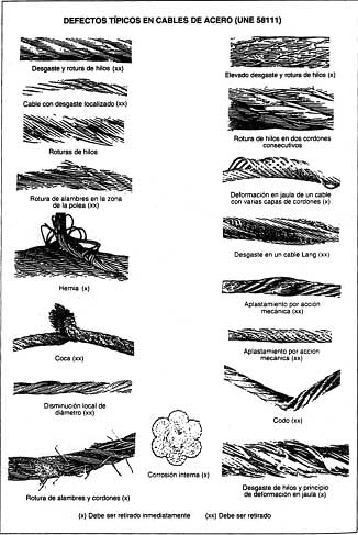– Cuando el número de alambres rotos visibles alcanza el 20 % del número total de hilos del cable, en una longitud igual a dos veces el paso del cableado. O 10 % de hilos rotos en una longitud L = 10 d