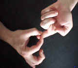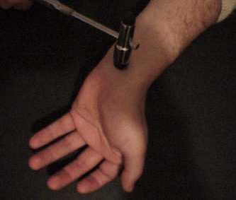 El signo con mayor valor predictivo es el de Flick. Es positivo cuando el paciente al ser preguntado: “¿Qué hace usted con la mano cuando los síntomas están peor?” responde agitando su mano de la misma manera que lo hace para bajar un termómetro. También son útiles y bastante seguros: incapacidad para distinguir estímulos dolorosos en la región palmar del dedo índice en relación con el otro lado y el diagrama de la mano de Katz (patrón clásico o probable). Menos útiles aunque más utilizados son el signo de Phalen ( la flexión máxima de ambos carpos (ventral) durante 2 minutos produce parestesias) y el signo de Tinel (la percusión con el martillo de reflejos sobre el ligamento anular -cara ventral muñeca- produce sensación de descarga eléctrica sobre 2º y 3º dedos) (ver fotografias de la derecha).