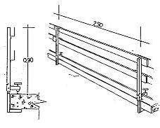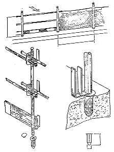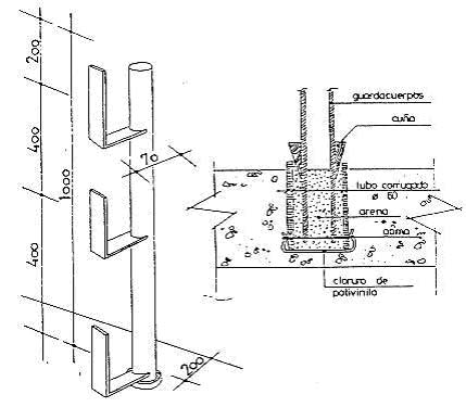 Montante incorporable al forjado Básicamente consiste en introducir en el hormigón del forjado, cuando se está hormigonando, un cartucho en el cual se introducirá luego el montante soporte de la barandilla. Este cartucho podrá ser de cualquier material, ya que su única misión es servir de encofrado para dejar un agujero en el hormigón para introducir el montante. El cartucho se deberá tapar mientras no se coloque el montante, para que no se tapone de suciedad. Las dimensiones de dicho agujero serán ligeramente mayores que el montante para que se pueda introducir fácilmente y, si existe mucha holgura, una vez introducido se afianzará con cunas. Existen varios sistemas de montantes incorporados al forjado (figuras 3 y 4).