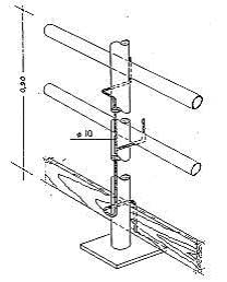 Montante de tipo puntal El montante es un puntal metálico, en el cual no se pueden clavar las maderas de la barandilla. Si la barandilla es metálica y se ata al puntal con alambres o cuerdas, existe el peligro de deslizamiento, con lo que perdería todo su efecto de protección. Hay diversos tipos de soportes para barandilla, acoplable a puntales metálicos (figuras 5 y 6).