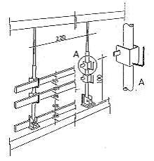 Montantes tipo “sargento” El montante es de tubo cuadrado y se sujeta en forma de pinza al forjado. La anchura de esta pinza es graduable, de acuerdo con el espesor del forjado. En el mismo van colgados unos soportes donde se apoyan los diferentes elementos de la barandilla (figuras 7 y 8). A continuación se muestran dos sistemas de montantes incorporados al forjado, pero sus variantes pueden ser muchas siempre que cumplan los requisitos anteriormente descritos.