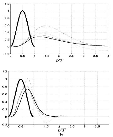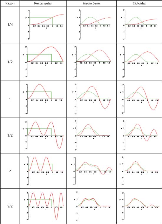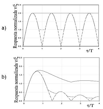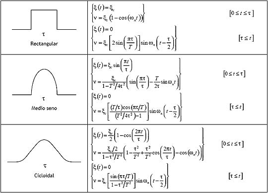 En la tabla II se ilustra una serie de respuestas típicas para tres pulsos simétricos, en función de la duración del pulso τ y el periodo natural del sistema T. La importancia del parámetro τ /T radica en que es un indicador de la duración del pulso tomando como referencia el periodo natural del sistema, y permite distinguir tres casos principales dependiendo del valor de τ /T: