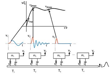 Fig. 3. Concepto del espectro de impacto por medio de una serie de sistemas MKC sujetos a un impacto.