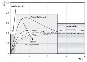 • Zona de amplificación.- En la zona media se encuentran los impactos cuya duración es cercana al periodo natural del sistema, y en este caso la respuesta es amplifi cada. Es en esta zona donde al amortiguamiento tiene un mayor efecto en cuanto a reducir la respuesta del sistema.