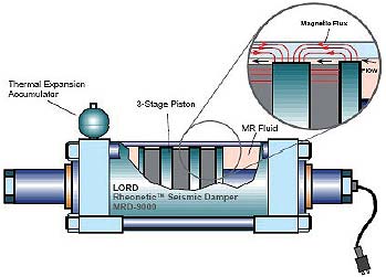 ante la presencia de un campo eléctrico o magnético, dependiendo del caso. Sus principales ventajas son una rápida velocidad de reacción, en el orden de los milisegundos, pero como desventajas se tienen los altos voltajes requeridos, y el comportamiento no lineal que presentan.11 En la figura 7 se muestra un esquema de un amortiguador variable disponible comercialmente.