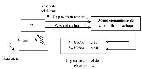 La figura 9 ilustra un ejemplo de esquema de control de un sistema con elasticidad variable. En este caso las variables usadas son la velocidad y el desplazamiento absolutos y el producto de estas variables defi ne el valor de la elasticidad a usar. Esta lógica es usada en sistemas con poco amortiguamiento, con el fin de atenuar las vibraciones modificando la rigidez de los elementos elásticos.