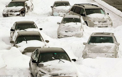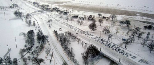 ¿Una escena del film de ciencia ficción “El Día Después de Mañana?” No, estos automóviles atorados en los carriles en dirección norte del Lake Shore Drive, Chicago, después de que accidentes y nieve volando vararon a los conductores durante la gran ventisca de anoche. A media mañana habían caído 50 cm de nieve, haciendo de esta tormenta la tercera más grande registrada en la ciudad.