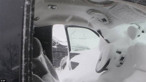 El interior de una pickup que quedó varada y abandonada en Lake Shore Drive el miércoles, muestra la ferocidad de la nevada que casi cubre el volante.