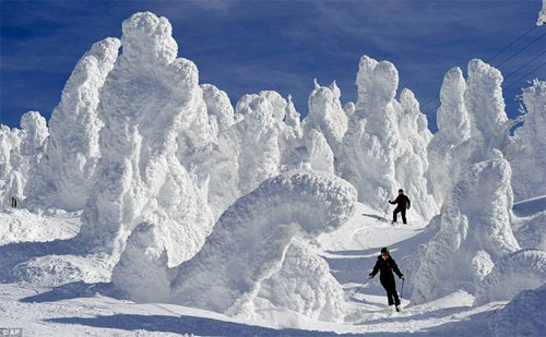 Como extrañas criaturas elevándose del suelo, estos árboles están recubiertos de nieve y hielo después de un congelante frío en el norte de Japón. Saboreando al increíble escenario esquiadores hacen su descenso en las pistas de esquí de Zao Onsen.