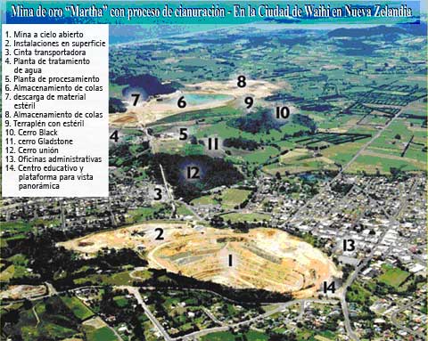 Finalmente, a los efectos demostrativos, reafirmé tal aseveración, con la entrega de la foto aérea, que se acompaña en este artículo, de la mina de oro “Martha”, con proceso de cianuración, ubicada en la localidad de Waihi, en Nueva Zelanda.