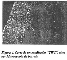 Este último es el más empleado en aplicaciones a fuentes móviles en los que se utilizan monolitos de cordierita o metálicos, que se recubren con el soporte (generalmente alúmina convenientemente estabilizada con óxidos de Ce, Ba, etc.), sobre el que se dispersan los elementos activos: Pt, Rh o Pd: catalizadores “TWC” (ver figura 4). Sin embargo, la aplicación de este método a sistemas que deben operar en corrientes gaseosas que llevan partículas en suspensión resulta poco conveniente, pues en esas condiciones la resistencia del recubrimiento a la desactivación por abrasión es muy baja.
