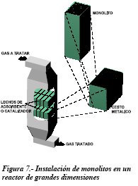 Estos monolitos suelen ir agrupados en cestas, las cuales se acoplan hasta completar la sección del reactor catalítico. En algunos casos, como en la depuración de Centrales térmicas, en los que los volúmenes de gases a tratar son muy grandes, se hace necesario la colocación de varias capas o pisos de monolitos (ver fig.7) de forma que el sistema de depuración adquiere unas dimensiones considerables.