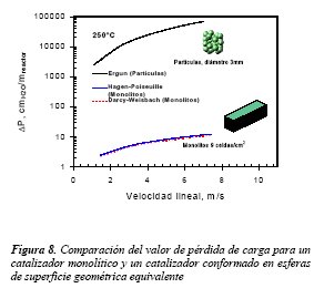 En este sentido los catalizadores monolíticos presentan una ventaja decisiva, puesto que la pérdida de carga que se produce en el sistema utilizando monolitos es de aproximadamente dos órdenes de magnitud menor que la generada por catalizadores granulares (ver fig. 8), cuando se comparan catalizadores con una superficie geométrica por unidad de volumen equivalente.