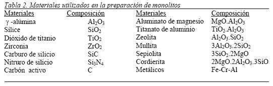 En la Tabla 2 se muestran los materiales básicos más frecuentemente utilizados en la preparación de monolitos. En algunos casos se emplean mezclas como son los casos de cordierita-mullita, aluminato de magnesio-zirconia, etc.