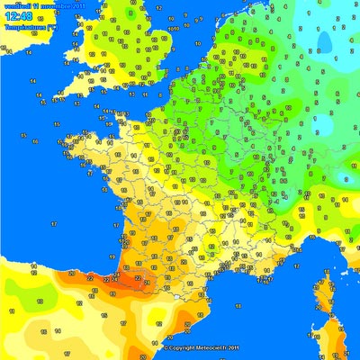 Mapa de temperaturas a las 12 h. del día de San Martín. Mucho calor en la costa del País Vasco. Lo sigue haciendo. Lleva varios días arreciando el viento sur y el efecto foehn provoca que en esta zona geográfica la temperatura se dispare. Pero no es una anomalía. Es una tipicidad. Lo expliqué en otro post; si tienen tiempo, les ruego que cliquen aquí: efecto foehn.