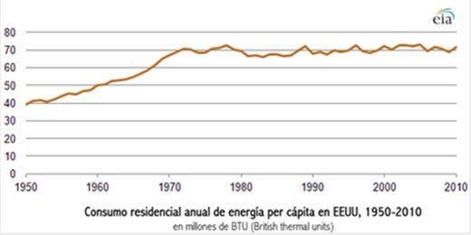 Desde hace cuarenta años (desde 1973) el consumo de energía per cápita en las casas de los estado-unidenses no ha aumentado, a pesar de que en esos cuarenta años el espacio de vivienda per cápita se ha duplicado. A medida que el espacio habitable ha ido aumentando, lógicamente también ha aumen-tado el espacio per cápita necesitado de calefacción y aire acondicionado, así como el número de aparatos domésticos repartidos por más cuartos.