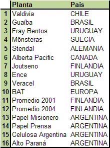 Este artículo está motivado por el hecho de que pese a que las denuncias sobre contaminación de las pasteras argentinas viene de muy antiguo (por ejemplo, este es un artículo de Octubre del 2000) es muy difícil encontrar información precisa sobre los niveles de vertido de sustancias potencialmente contaminantes para esas pasteras. Por lo tanto, con valiosa ayuda, hemos hecho un pequeño rastreo de información para poner en unas gráficas ilustrativas. La lista de la izuierda muestra las plantas de celulosa que vamos a comparar. Se incluyen las más modernas en el mundo y en la región (Chile, Brasil y Uruguay) y algunas de las pasteras/papeleras argentinas, concretamente las que están sobre el río Paraná. Excluí Puerto Piray porque los datos son tan escandalosamente grandes que impiden apreciar el resto (Puerto Piray es una fábrica de 1928 que no hay manera de salvar, debería ser cerrada si o si). Respecto a la versión anterior de este artículo (modificada el 09/02/2008) la diferencia es que añadí los datos comprometidos por la pastera ENCE en su Estudio de Impacto Ambiental Resumen (EIAr) que acaba de ser puesto en línea por la Dinama.