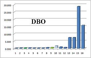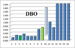Para evitar hacer este artículo extremadamente árido, voy a obviar la metodología con la cual obtuvimos los datos que se señalan, pero es importante indicar que se trata de información públicamente disponible. Recordemos que los parámetros más importantes en cuanto a la posible contaminación del recurso hídrico se expresa en la Demanda Química de Oxígeno (DQO), la Demanda Biológica de Oxígeno (DBO) y los halogenuros orgánicos absorbibles (AOX). En la primera gráfica que mostramos se ve el valor de DQO para los 16 casos identificados en la Tabla anterior. La barra “flotante” identifica el rango identificado en las BATs como recomendación para las emisiones de DQO. Como se ve ahí, todas las pasteras de última generación (incluyendo Botnia, en verde oscuro y Ence, en verde claro) emiten ya por debajo del límite inferior de las recomendaciones de las BATs, por lo que puede decirse que las mejores tecnologías disponibles hoy en día permiten construir fábricas que sean sensiblemente mejores que las recomendaciones. Las pasteras argentinas acusadas de ser contaminantes no cumplen con las BATs (más allá de que puedan o no cumplir con las reglamentaciones nacionales, eso no lo sé).