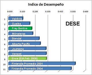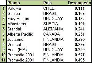 Claramente se ve en los números que Ence está diseñada para tener un desempeño similar al de Veracel en Brasil o Joutseno en Finlandia, por lo que podemos estimar que su desempeño será mejor y posiblemente en el rango de Fray Bentos y Mönsteras. Tendremos que esperar casi dos años para saberlo. La figura a la derecha muestra en forma gráfica el ranking de las fábricas de acuerdo a este índice.